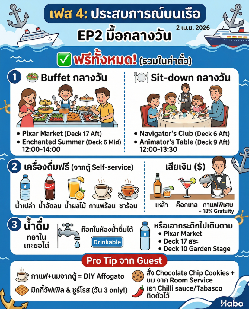 - Sit-down: Navigator’s Club (Deck 6 Aft) และ Animator’s Table (Deck 9 Aft) เปิด 12:00 – 13:30 น.