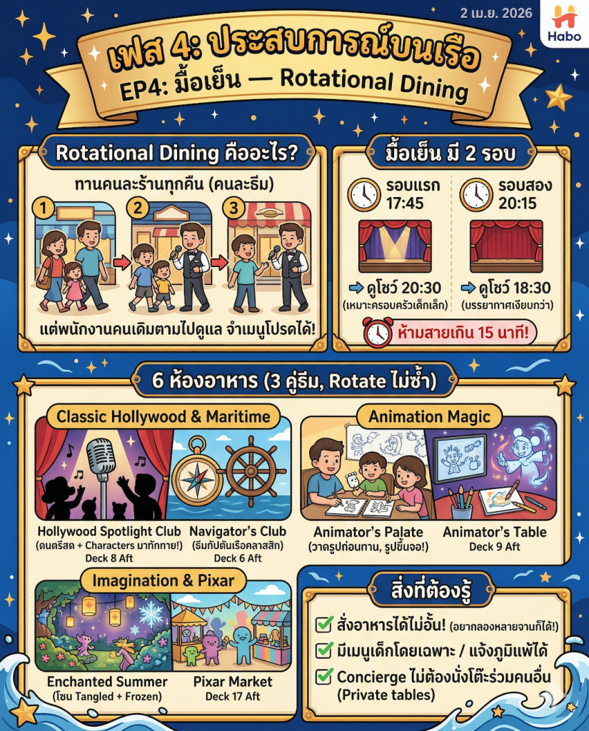 ไฮไลท์ที่โดดเด่นที่สุดของ Disney Cruise คือ Rotational Dining ครับ หมายความว่าคุณจะได้เปลี่ยนร้านอาหารทุกคืนตามธีมที่กำหนด แต่ “ทีมพนักงานเสิร์ฟ” (Server) ชุดเดิมจะตามไปดูแลคุณทุกร้าน ทำให้เขารู้ใจคุณว่าชอบดื่มอะไร หรือแพ้อาหารอะไร ดูแลดีเหมือนคนในครอบครัวเลยครับ