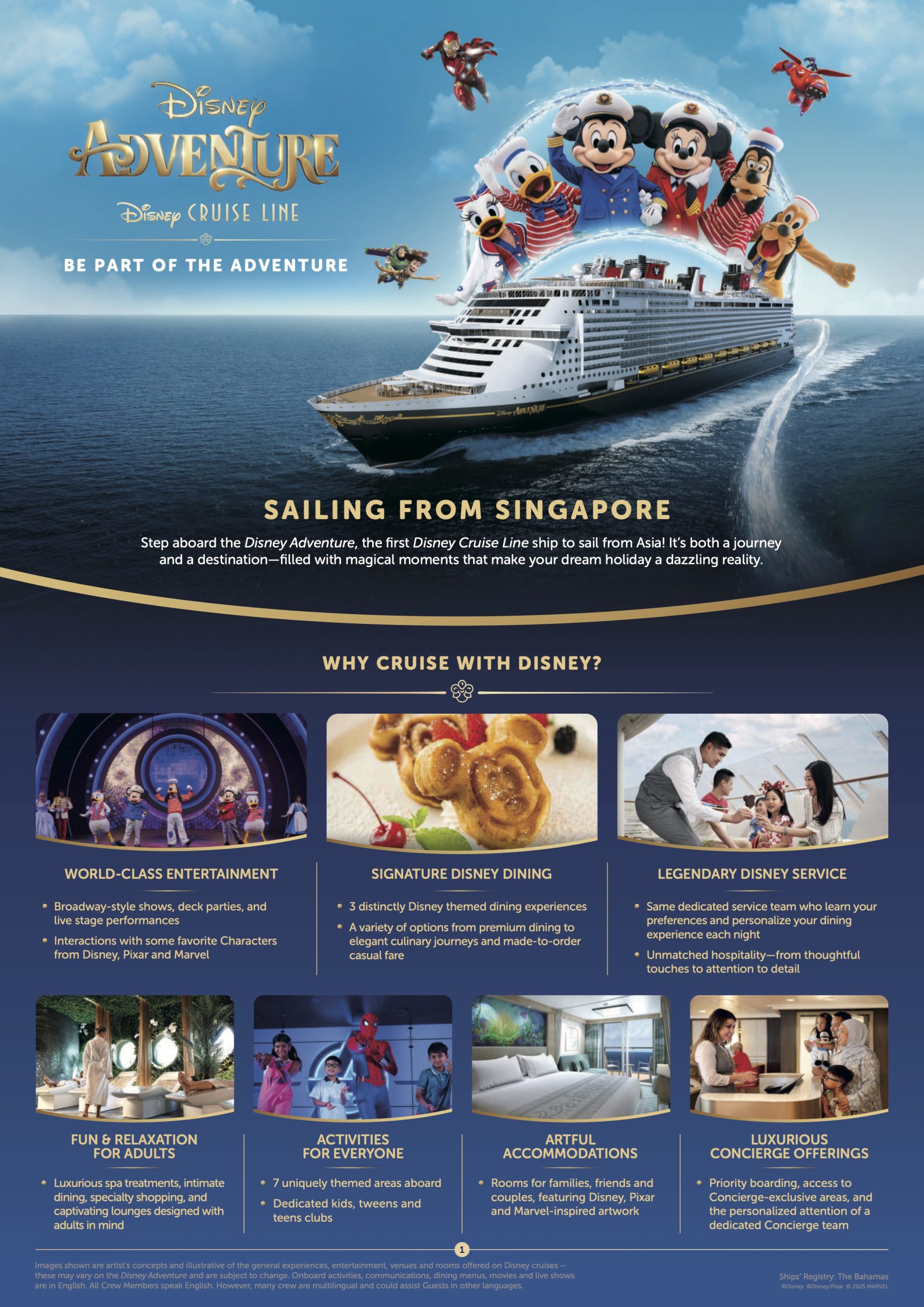 - เรือลำแรกที่ออกเดินทางจากเอเชีย: Disney Adventure เป็นเรือลำแรกของ Disney Cruise Line ที่มีฐานหลักอยู่ใน สิงคโปร์ เพื่อเปิดประสบการณ์มหัศจรรย์ในภูมิภาคเอเชียเริ่มตั้งแต่เดือนธันวาคม 2025 เป็นต้นไป,,