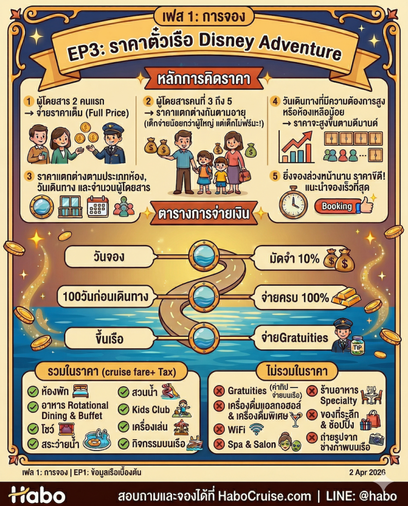 เดินทางมาถึง EP. 3 กันแล้วสำหรับซีรีส์เจาะลึกเรือสำราญ Disney Adventure หลังจากที่เราไปสำรวจโซนต่างๆ และเลือกห้องพักในฝันกันไปแล้ว คำถามยอดฮิตอันดับถัดมาที่หนีไม่พ้นก็คือ “ตกลงแล้วไปทริปนี้ต้องเตรียมงบเท่าไหร่?” หลายคนอาจจะมองว่าการไปล่องเรือสำราญต้องแพงแน่ๆ แต่ความจริงแล้ว หากเราเข้าใจโครงสร้างราคาและรู้ทริคการจอง เราก็สามารถวางแผนงบประมาณให้คุ้มค่าที่สุดได้ครับ มาเจาะลึกกันเลยว่าระบบราคาของ Disney Cruise Line เค้าคิดกันยังไง!